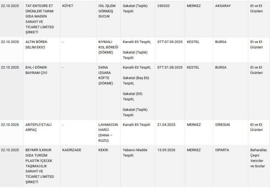 Kestel'de Altın Börek'te üretilen kıymalı kol böreğinin içinde kanatlı eti ve sakatat (taşlık) tespit edilirken Ehl-i Döner'de satılan dana ızgara köftenin içinden kanatlı eti, sakatat (Baş eti, dil ve taşlık) çıktı.
