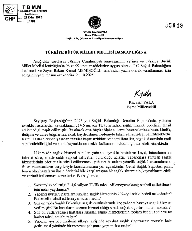 Bursa Milletvekili Pala'dan Bakanlığa yabancı hastalardan alınmayan 214,6 milyon TL hakkında soru önergesi