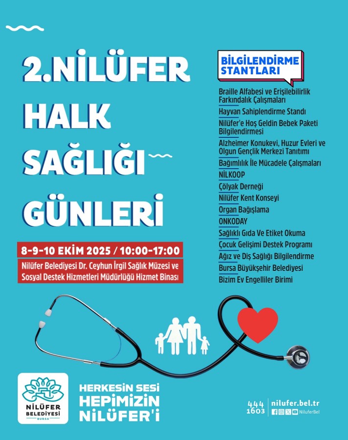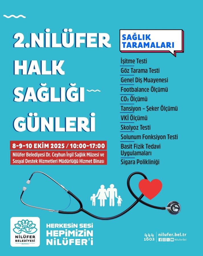 BURSA, 01 Ekim 2025 Çarşamba, 13:26Nilüfer Belediyesi, halk sağlığı bilincini artırmak ve koruyucu sağlık hizmetlerini yaygınlaştırmak amacıyla düzenlediği Halk Sağlığı Günleri'nin ikincisini gerçekleştiriyor. 8-9-10 Ekim tarihlerinde yapılacak etkinlikte, üç gün boyunca ücretsiz sağlık taramaları, farkındalık stantları ve eğitici atölyelerle dolu bir program Nilüferlileri bekliyor.