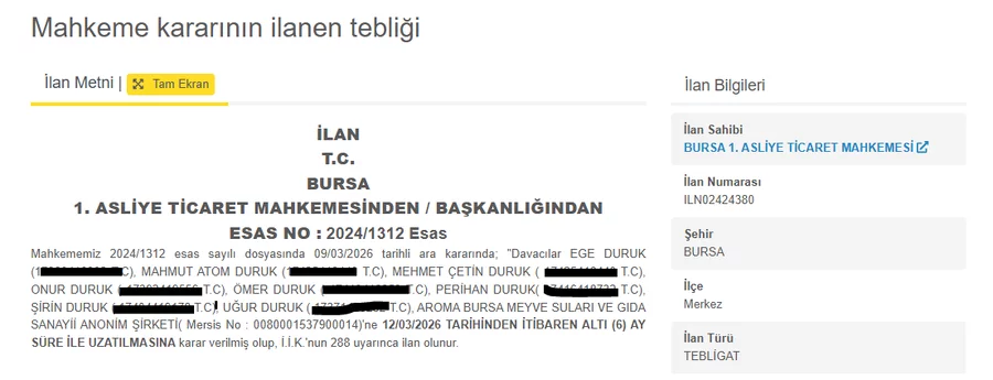 Söz konusu karar, İcra ve İflas Kanunu'nun 288. maddesi uyarınca kamuoyuna ilan edildi.