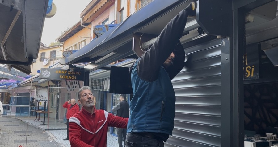 BURSA, 02 Aralık 2025 Salı, 13:28Bursa'da tarihi dokusuyla ün salan ve turizm alanlarından biri olan, Arap Şükrü Sokağ'ında işletmeler usülsüz tente kullandıkları nedeniyle belediye ekipleri harekete geçti.