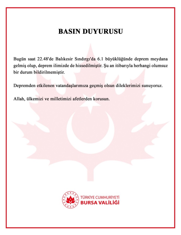 Bursa Valiliği'nin açıklamasında, "Bugün saat 22.48'de Balıkesir Sındırgı'da 6.1 büyüklüğünde deprem meydana gelmiş olup, deprem ilimizde de hissedilmiştir. Şu an itibarıyla herhangi olumsuz bir durum bildirilmemiştir.