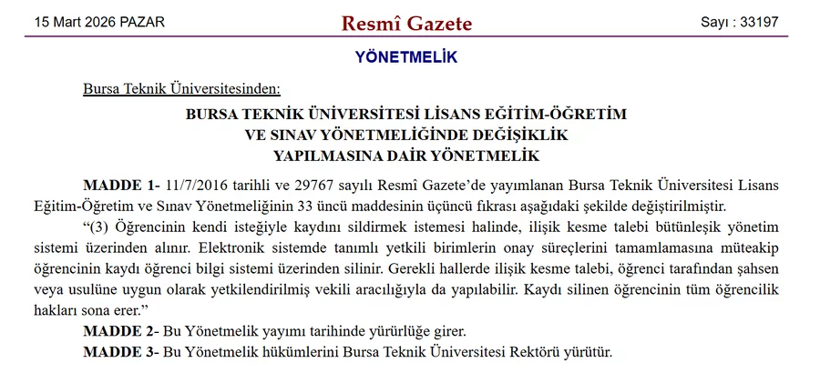 Yayımlanan yönetmelikle, Bursa Teknik Üniversitesi Lisans Eğitim-Öğretim ve Sınav Yönetmeliğinin 33'üncü maddesinin üçüncü fıkrası yeniden düzenlenerek öğrencilerin kendi isteğiyle kayıt sildirme işlemlerinin yürütülme usulleri güncellendi.