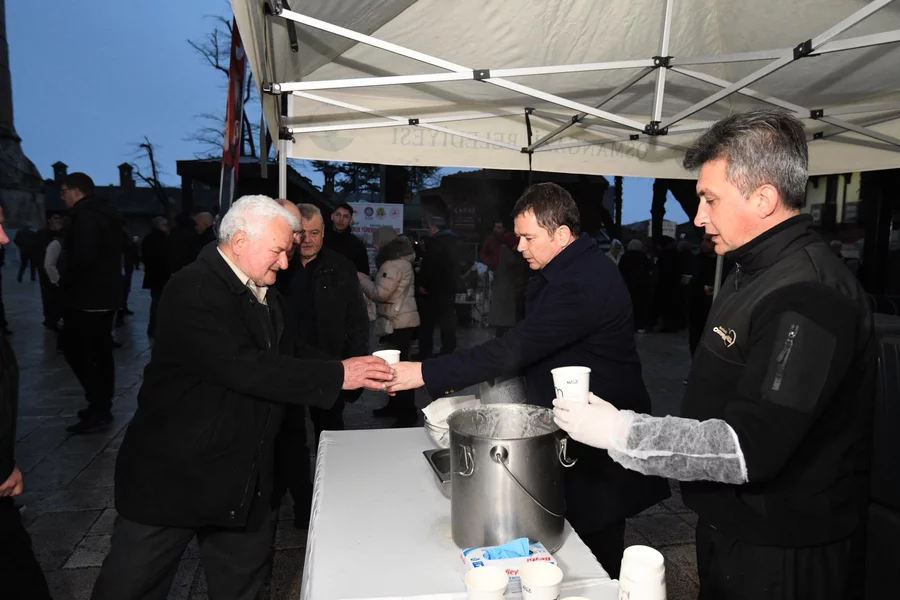 Sabah namazı ve fetih duasının ardından vatandaşlarla bir araya gelen Başkan Aydın, Ulu Cami avlusunda vatandaşlara çorba ikramında bulundu.