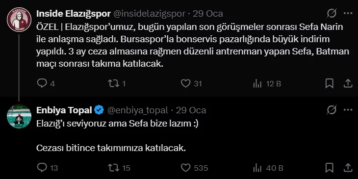 BURSASPOR, 31 Ocak 2026 Cumartesi, 01:30Bursaspor Kulübü Proje Kurulu Başkanı ve Bursastore Sorumlusu Enbiya Topal, sosyal medyada yapılan bir paylaşıma verdiği yanıtla Sefa Narin'in takımda kalacağını duyurdu.