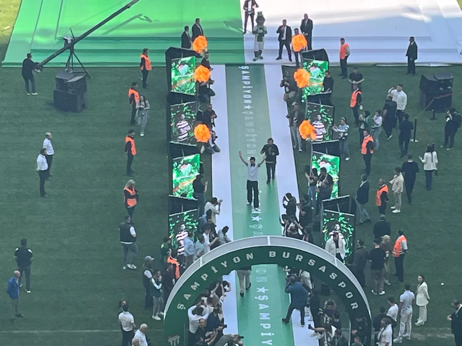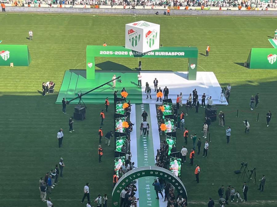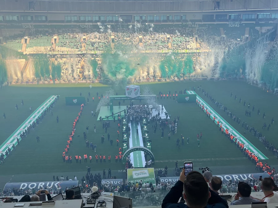 Stadyumda yapılan etkinlikte binlerce taraftar, meşaleler, bayraklar ve marşlarla unutulmaz bir atmosfer oluşturdu. Yönetim, teknik heyet ve futbolcular sahaya ortasına kurulan şampiyonluk sahnesine çıkarak taraftarları selamladı. Yapılan seremoninin ardından binlerce taraftar hep bir anda sahaya indi. Haftalar öncesinden yapılan uyarılara rağmen sahaya inen taraftarları polis ekipleri ve güvenlik görevlileri dışarıya çıkarmak için mücadele verdi. Bursaspor amigolarının yaptığı anonslar sonrasında sahaya giren taraftarlar yeniden tribüne çıktı.