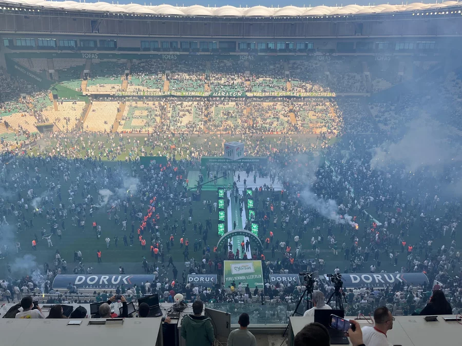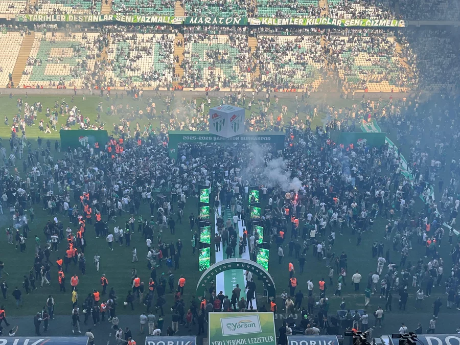 BURSASPOR, 26 Nisan 2026 Pazar, 17:27Kupa töreni sırasında binlerce taraftar sahaya inince görüntüler Bursaspor'un Süper Lig şampiyonluğunu akıllara getirdi.