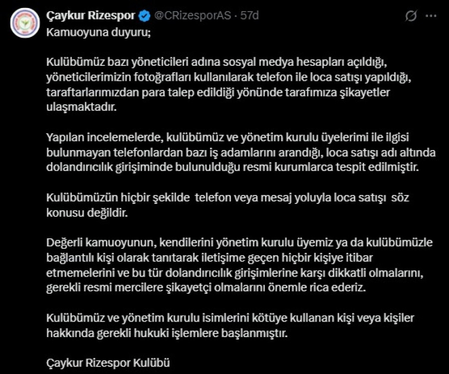 "Loca satışı adı altında dolandırıcılık girişiminde bulunulduğu resmi kurumlarca tespit edilmiştir. Kulübümüzün hiçbir şekilde telefon veya mesaj yoluyla loca satışı söz konusu değildir. Değerli kamuoyunun, kendilerini yönetim kurulu üyemiz ya da kulübümüzle bağlantılı kişi olarak tanıtarak iletişime geçen hiçbir kişiye itibar etmemelerini ve bu tür dolandırıcılık girişimlerine karşı dikkatli olmalarını, gerekli resmi mercilere şikayetçi olmalarını önemle rica ederiz."