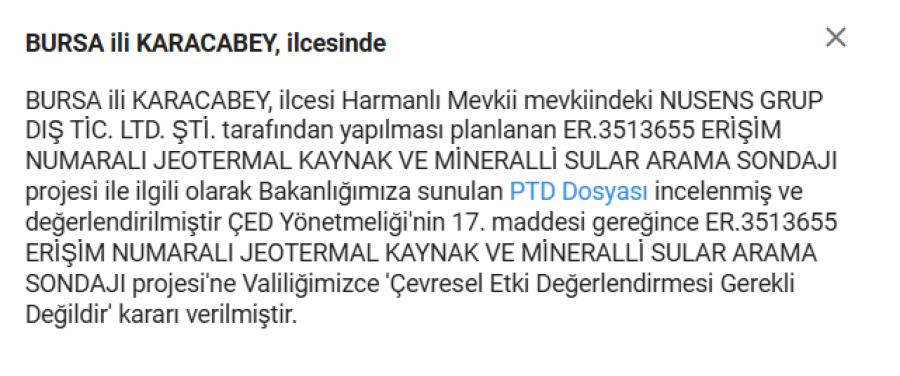 Bakanlıktan yapılan duyuruda, Jeotermal Kaynak ve Mineralli Sular Arama Sondajı Projesi için sunulan Proje Tanıtım Dosyası (PTD)'nın incelendiği ve ÇED Yönetmeliği'nin 17. maddesi gereğince proje hakkında "Çevresel Etki Değerlendirmesi Gerekli Değildir" kararı verildiği bildirildi.