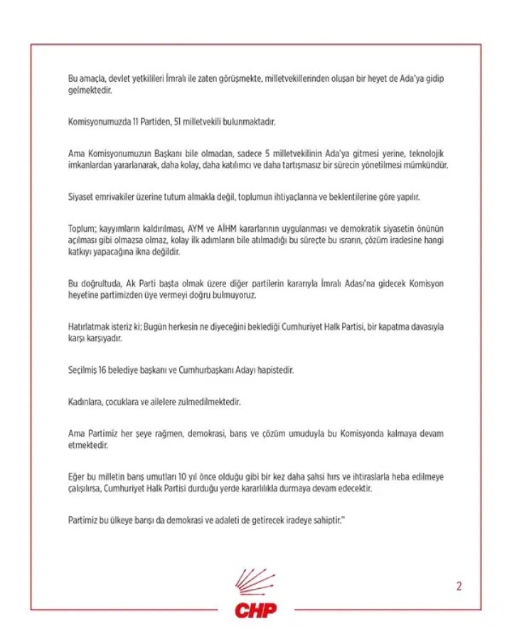 Cumhuriyet'in aktardığı habere göre, Cumhuriyet Halk Partisi, İmralı'ya gidecek olası bir heyete üye vermeme kararına ilişkin yazılı açıklama yayımladı.