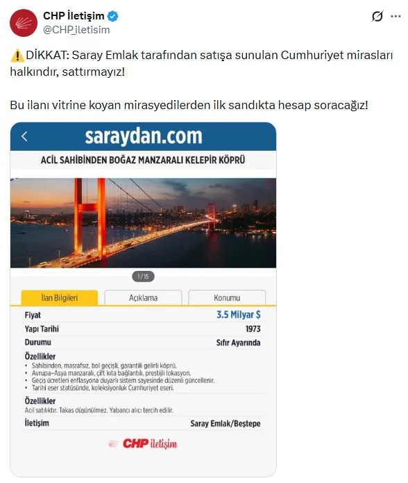 CHP'den 'kelepir köprü' göndermesi: "Cumhuriyet mirasları halkındır, sattırmayız!"