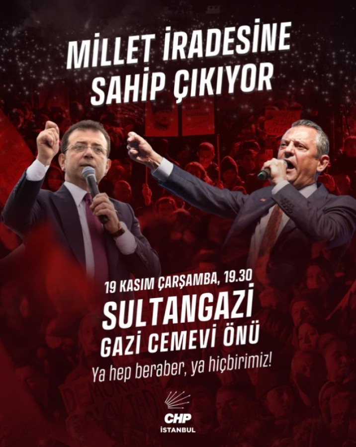 CHP, 19 Kasım Çarşamba günü saat 19.30'da Sultangazi Gazi Cemevi önünde "ya hep beraber ya hiçbirimiz" sloganıyla yurttaşlarla bir araya gelecek.