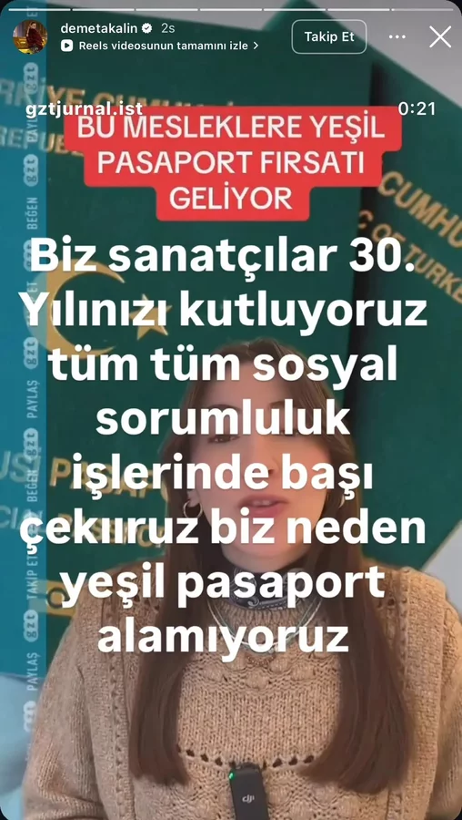 Teklifi eleştirenlerden isimlerden biri de şarkıcı Demet Akalın oldu. Akalın, söz konusu haberi Instagram hesabından paylaşarak, "Biz sanatçılar 30. yılımızı kutluyoruz, tüm sosyal sorumluluk işlerinde başı çekiyoruz. Biz neden yeşil pasaport alamıyoruz?" notunu düştü.