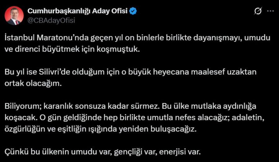 Geçen sene düzenlenen koşuya bizzat kendisinin de katıldığını hatırlatan İmamoğlu, bu yıl tutuklu olduğu Silivri'den heyecana uzaktan ortak olacağını ifade etti.