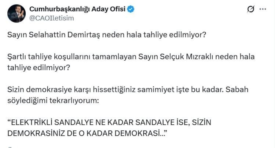 "Sayın Selahattin Demirtaş neden hala tahliye edilmiyor? Şartlı tahliye koşullarını tamamlayan Sayın Selçuk Mızraklı neden hala tahliye edilmiyor? Sizin demokrasiye karşı hissettiğiniz samimiyet işte bu kadar.
