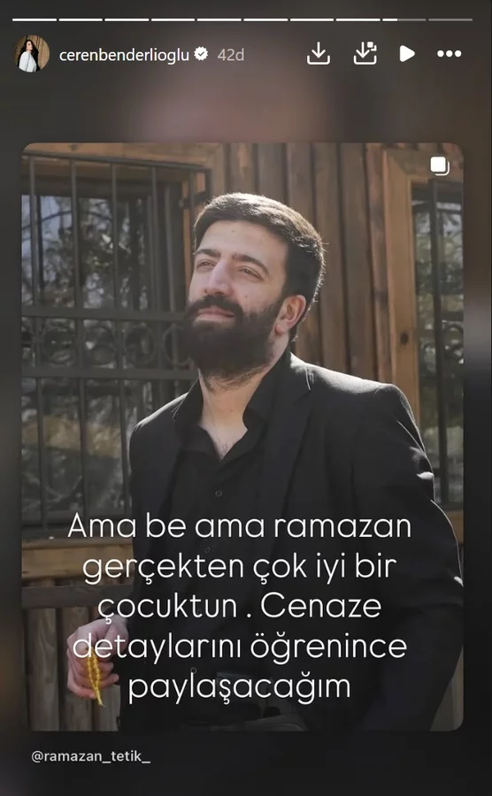 MAGAZİN, 01 Nisan 2026 Çarşamba, 22:02Eşref Rüya dizisinde rol alan Ceren Benderlioğlu, meslektaşının vefat haberisi sosyal medyadan duyurduç Benderlioğlu "Ama be ama ramazan gerçekten çok iyi bir çocuktun. Cenaze detaylarını öğrenince paylaşacağım" ifadelerini kullandı.