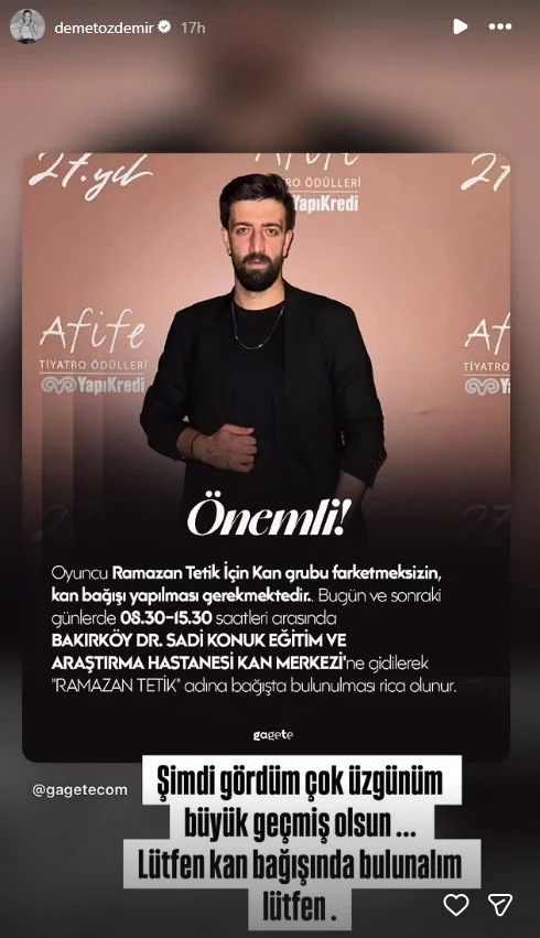 Ünlü oyuncu Demet Özdemir de çağrıya kayıtsız kalmamıştı. Sosyal medya hesabından paylaşım yapan Özdemir, "Çok üzgünüm, büyük geçmiş olsun. Lütfen kan bağışında bulunalım lütfen" sözleriyle takipçilerine seslenmişti.