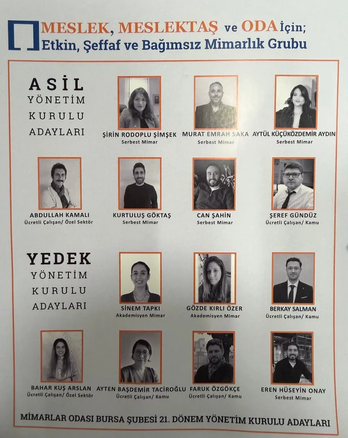 Mimarlar Odası Bursa Şubesi 21. Dönem Yönetim Kurulu Adayları şöyle:
