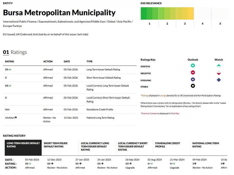 BURSA, 13 Şubat 2026 Cuma, 15:55Fitch tarafından yapılan açıklamada, Bursa Büyükşehir Belediyesi'nin not görünümünün 'stabil'den 'pozitif'e çıkarıldığı, kredi notunun ise 'BB-' olarak korunduğu bildirildi.
