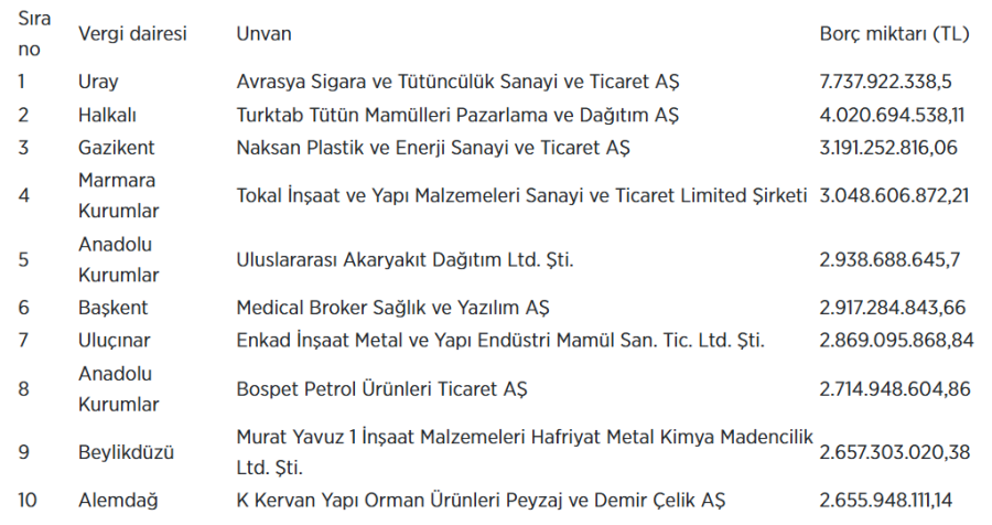 Borçlular listesinin ilk sırasında 7 milyar 737 milyon 922 bin lirayla Uray Vergi Dairesine kayıtlı Avrasya Sigara ve Tütüncülük Sanayi ve Ticaret AŞ yer aldı. Bu şirketi, 4 milyar 20 milyon 695 bin lirayla Turktab Tütün Mamülleri Pazarlama ve Dağıtım AŞ ve 3 milyar 191 milyon 253 bin lirayla Naksan Plastik ve Enerji Sanayi ve Ticaret AŞ takip etti.