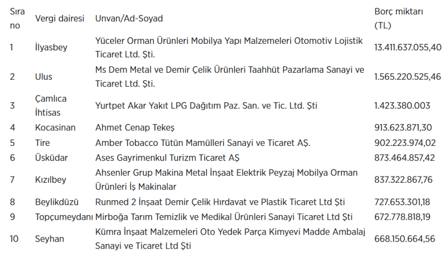 Listede, İlyasbey Vergi Dairesine kayıtlı Yüceler Orman Ürünleri Mobilya Yapı Malzemeleri Otomotiv Lojistik Ticaret Limited Şirketi 13 milyar 411 milyon 637 bin lirayla ilk sırada yer aldı. Bu şirketi 1 milyar 565 milyon 221 bin lirayla Ms Dem Metal ve Demir Çelik Ürünleri Taahhüt Pazarlama Sanayi ve Ticaret Limited Şirketi ve 1 milyar 423 milyon 380 bin lirayla Yurtpet Akar Yakıt LPG Dağıtım Paz. San. ve Tic. Ltd. Şti izledi.