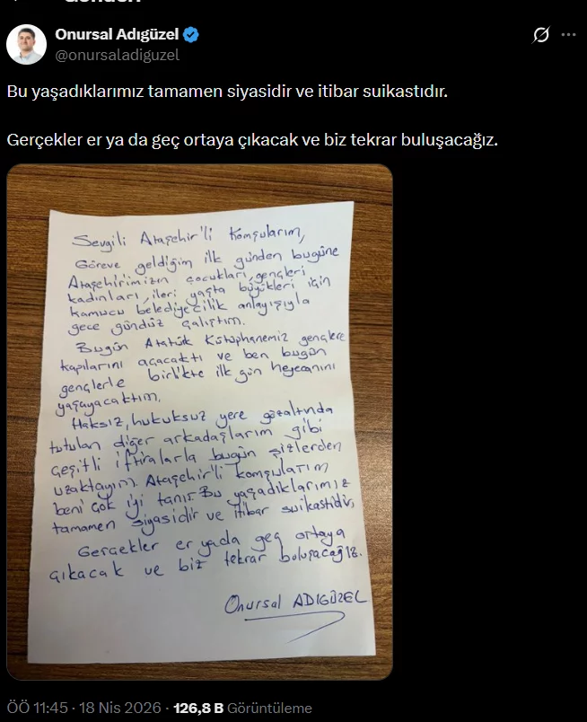 Gözaltına alınan Ataşehir Belediye Başkanı Onursal Adıgüzel'den ilk mesaj!