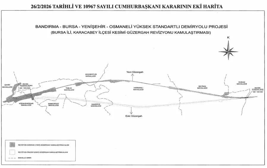 BURSA, 27 Şubat 2026 Cuma, 08:5427 Şubat 2026 tarihli Resmî Gazete'de yayımlanan 10967 sayılı Cumhurbaşkanı Kararı ile Bursa'yı kapsayan Bandırma-Bursa-Yenişehir-Osmaneli Yüksek Standartlı Demiryolu Projesi kapsamında acele kamulaştırma kararı alındı.