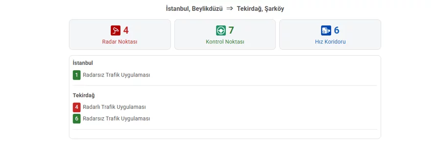 Bir başka örnek olarak, İstanbul Beylikdüzü'nden Tekirdağ Şarköy'e gitmek isteyen bir sürücünün önüne dört radar noktası, 7 kontrol noktası ve 16 hız koridoru çıkacak.