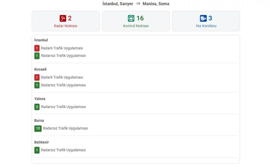 Örneğin İstanbul Sarıyer'den Manisa Soma'ya gidecek bir sürücünün rotasında 2 adet radar noktasıyla birlikte 16 kontrol noktası ve 3 hız koridoru bulunuyor.