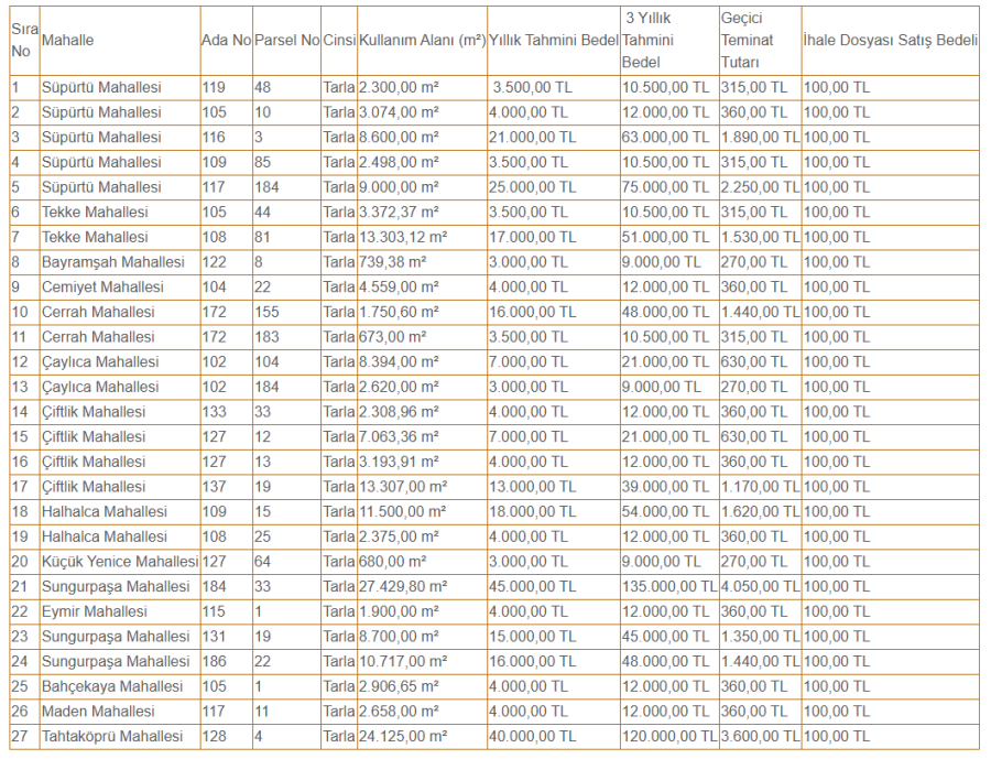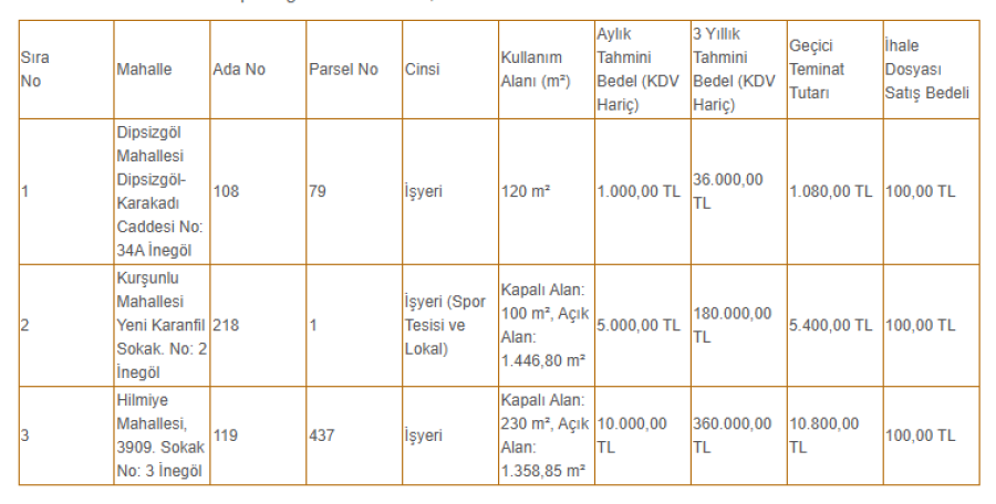 Belediyemiz mülkiyetin de bulunan ve aşağıdaki tabloda tapu kaydı ve nitelikleri belirtilen işyerleri ve tarlaların Belediye Encümenince 25.11.2025 Salı günü saat 11.00'da İnegöl Belediyesi Encümen Toplantı Salonunda (Kemalpaşa Mahallesi Adnan Menderes Bulvarı No:1/A İnegöl/BURSA) 2886 sayılı Devlet İhale Kanunu'nun 35/a maddesince kapalı teklif usulü ile 3 (üç) yıl süreli kiraya verilecektir.