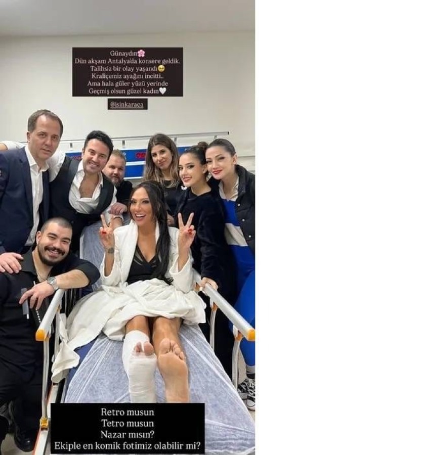 Ünlü şarkıcı, hasta yatağında ayağı sargılı bir şekilde poz verirken, fotoğrafı paylaşan arkadaşı "Dün akşam Antalya'da konsere geldik. Talihsiz bir olay yaşandı. Kraliçemiz ayağını incitti. Ama yine güler yüzü yerinde. Geçmiş olsun güzel kadın" ifadelerine yer verdi.