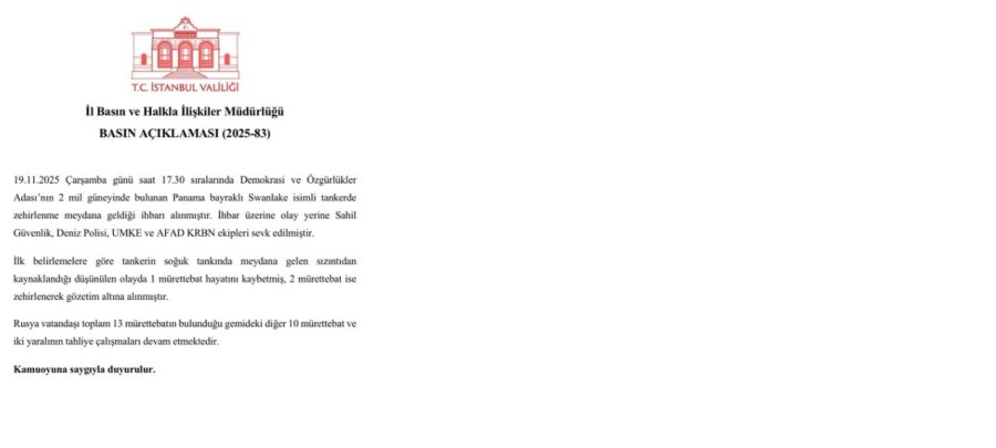 GÜNDEM, 19 Kasım 2025 Çarşamba, 19:31İstanbul açıklarında Panama bayraklı Swanlake isimli tankerde zehirlenme olayı yaşandı. Valiliğin açıklamasına göre, zehirlenme olayının ilk belirlemeler göre, soğuk tankında meydana gelen sızıntıdan kaynaklandığı düşünülüyor.