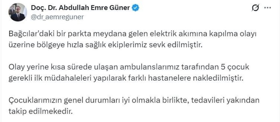 Olayla ilgili sosyal medya hesabından açıklama yapan İstanbul İl Sağlık Müdürü Abdullah Emre Güner, "Bağcılar'daki bir parkta meydana gelen elektrik akımına kapılma olayı üzerine bölgeye hızla sağlık ekiplerimiz sevk edilmiştir. Olay yerine kısa sürede ulaşan ambulanslarımız tarafından 5 çocuk gerekli ilk müdahaleleri yapılarak farklı hastanelere nakledilmiştir. Çocuklarımızın genel durumları iyi olmakla birlikte, tedavileri yakından takip edilmektedir" ifadelerini kullandı.