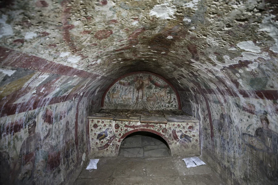 3. yüzyıla tarihlendirilen, üzerinde bir erkek, bir kadın ve bir bebek iskeleti bulunan klinenin (ölülerin yatırıldığı, genellikle taştan yapılmış sedir) ardındaki kuzey duvarında yer alan freskte, Hazreti İsa'nın çoban olarak omuzlarında bir, sağında ve solunda ikişer keçiyle tasvir edildiği görülüyor.
