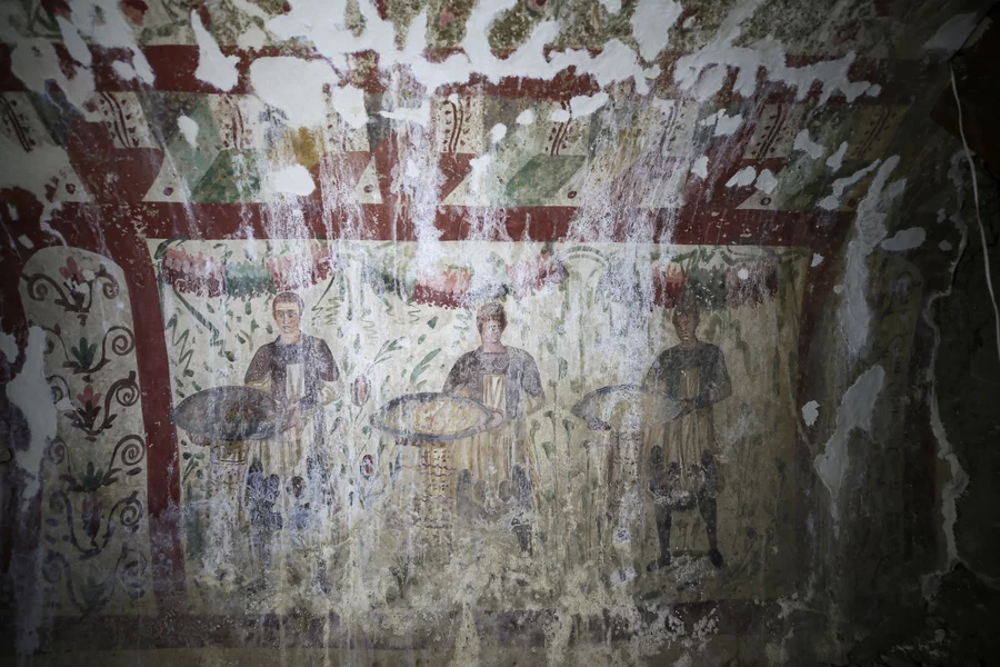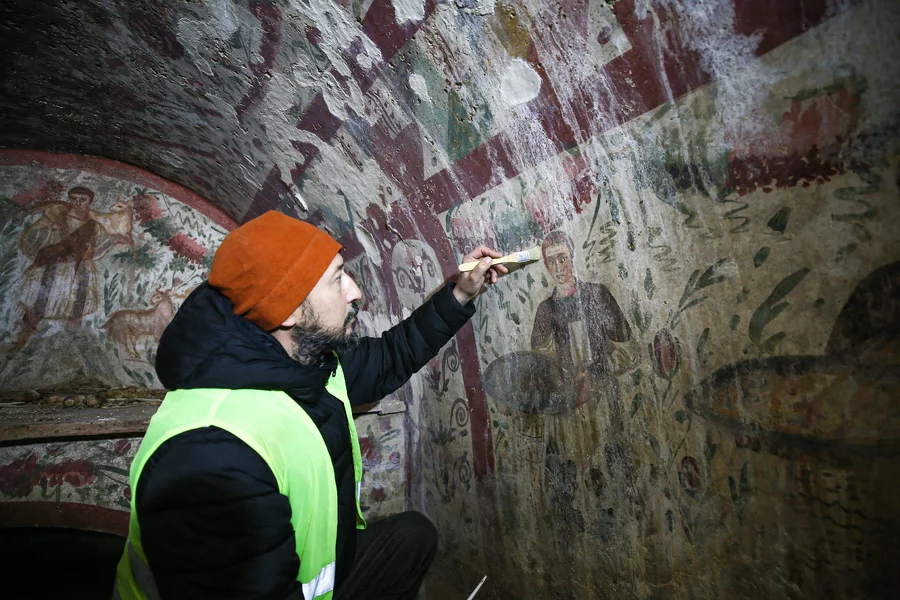 Roma ve Erken Bizans dönemi mezar geleneğini ortaya koymak için araştırma yapan arkeologlar, bu sezon alanda yaptıkları kazı sırasında, bir hipojede (yer altında tonozlu yapıyla inşa edilmiş mezar odası), çoban olarak tasvir edilmiş Hazreti İsa'nın freskine rastladı.