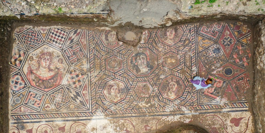 "Yapının ana duvarlarının duvar resimleriyle kaplı olduğu, yer döşemeleri mermerden yapılmış olduğu ancak hem duvar resimlerinin hem de döşemelerin zaman içerisinde tahrip edildiği ve söküldüğünü tespit ettik. Mozaiğin büyük bölümü, günümüze sağlam ulaşmış durumda. Mozaiğin mevcut kısmında, üç farklı panel var ve bunun çevresinde nar ve sarmaşık yapraklarıyla çevrilmiş bir bordür var. Yapının bir odasına açılan bir eşik önünde iki çift sandalet giriş ve çıkış şeklinde tasvir edilmiş. Bu, mozaikli tabanın merkezi olarak algıladığımız, yapının içerisine giriş yapılan nokta. Buradan baktığımızda mozaiğin sağa ve sola eşit gittiğini varsayarsak yaklaşık 20 metrelik bir kenar uzunluğu tahmin ediyoruz. Mozaiğin çok daha büyük bir alana yayıldığını, yapacağımız çalışmalarla tespit edeceğimizi umuyoruz."