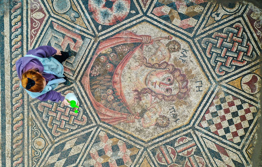 Merkezdeki bölümün etrafındaki saç örgüsü motiflerinin her rengin 3-4 farklı tonu kullanılarak yapıldığını, geometrik ve üç boyutlu motiflerle bezendiğini, labirent, gordion düğümü gibi motifler yapıldığını anlatan Kahveci, "Mozaikte 'tessera' dediğimiz yapı taşları, taş, mermer ve camdan temin ediliyor. Dış hatlarda bir, merkez tasvirlerde yarım santimetreküp. Oldukça detaylı bir çalışma yapılmış." dedi.