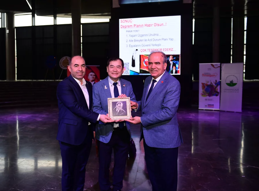 Söyleşinin ardından CHP Osmangazi İlçe Başkanı Raşit Gürbüz ve Osmangazi Belediyesi Meclis Üyesi Bakır Taşer, Yoshinori Moriwaki'ye teşekkür plaketi takdim etti.