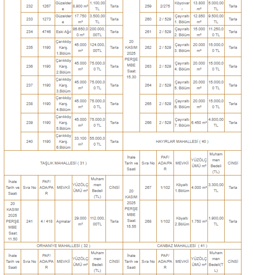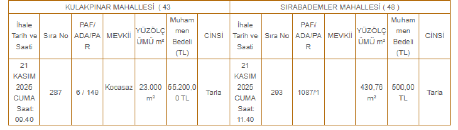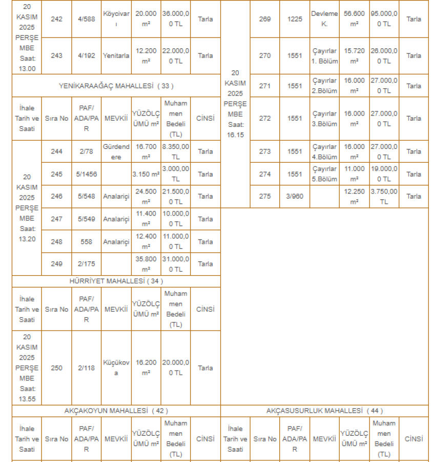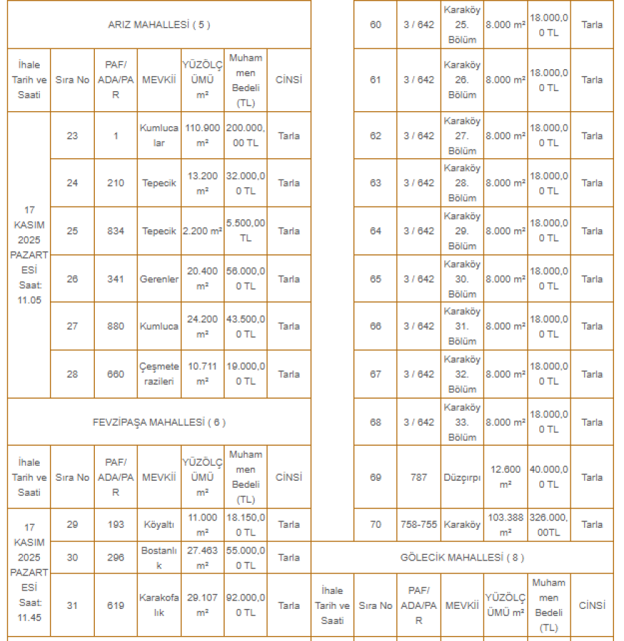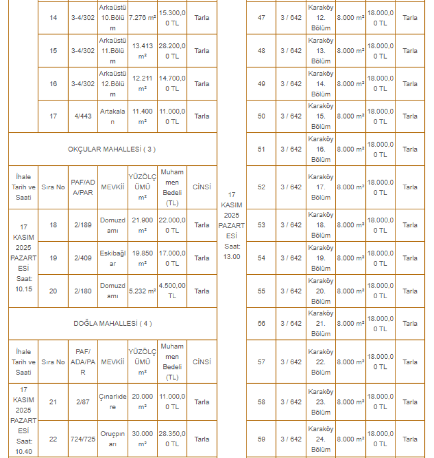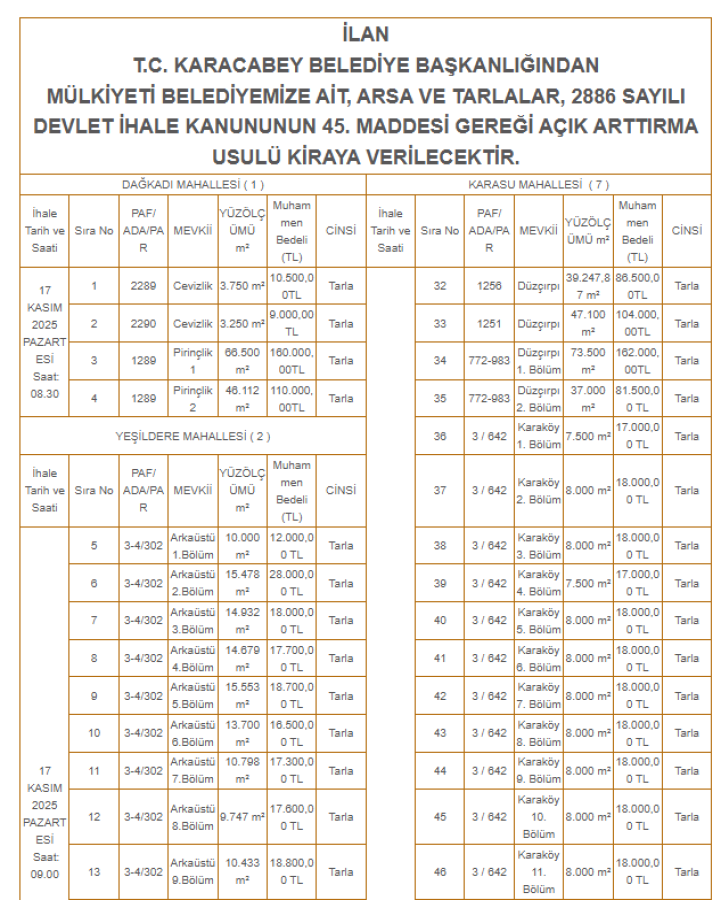 Karacabey Belediyesi'nden yapılan açıklamaya göre 17 - 21 Kasım tarihleri arasında yapılacak olan ihaleler, taşınmazların bulunduğu mahalle muhtarlık hizmet binalarında, belediye encümeni huzurunda gerçekleştirilecek.