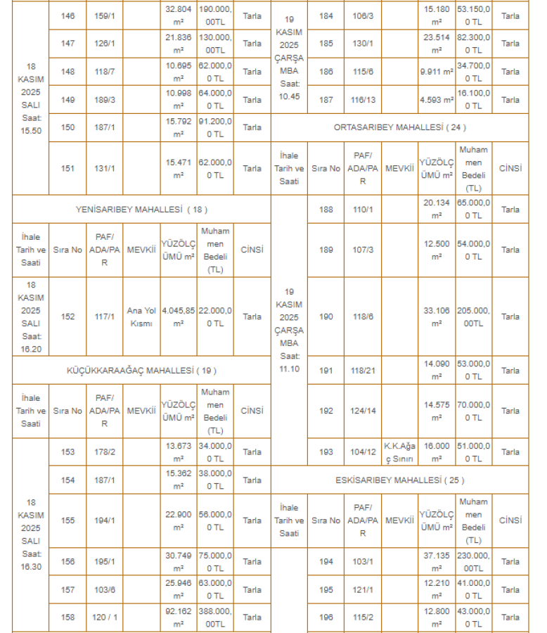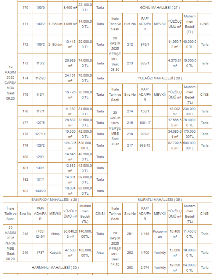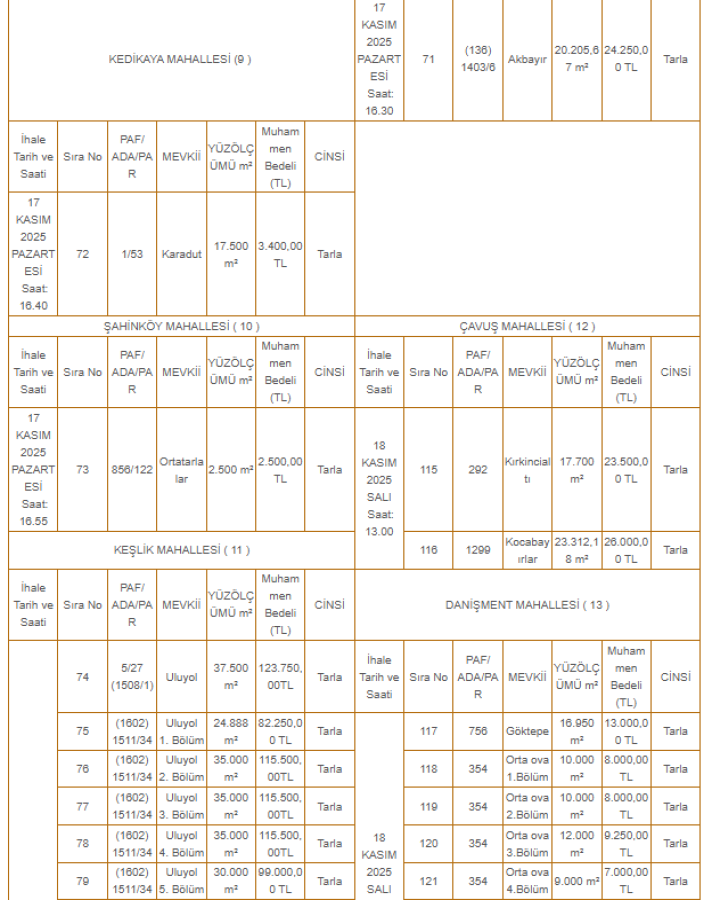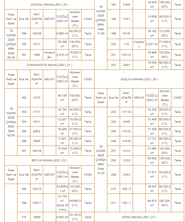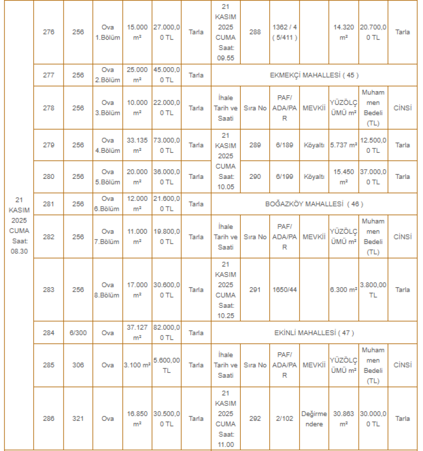Karacabey Belediyesi'nden yapılan açıklamaya göre 17 - 21 Kasım tarihleri arasında yapılacak olan ihaleler, taşınmazların bulunduğu mahalle muhtarlık hizmet binalarında, belediye encümeni huzurunda gerçekleştirilecek.