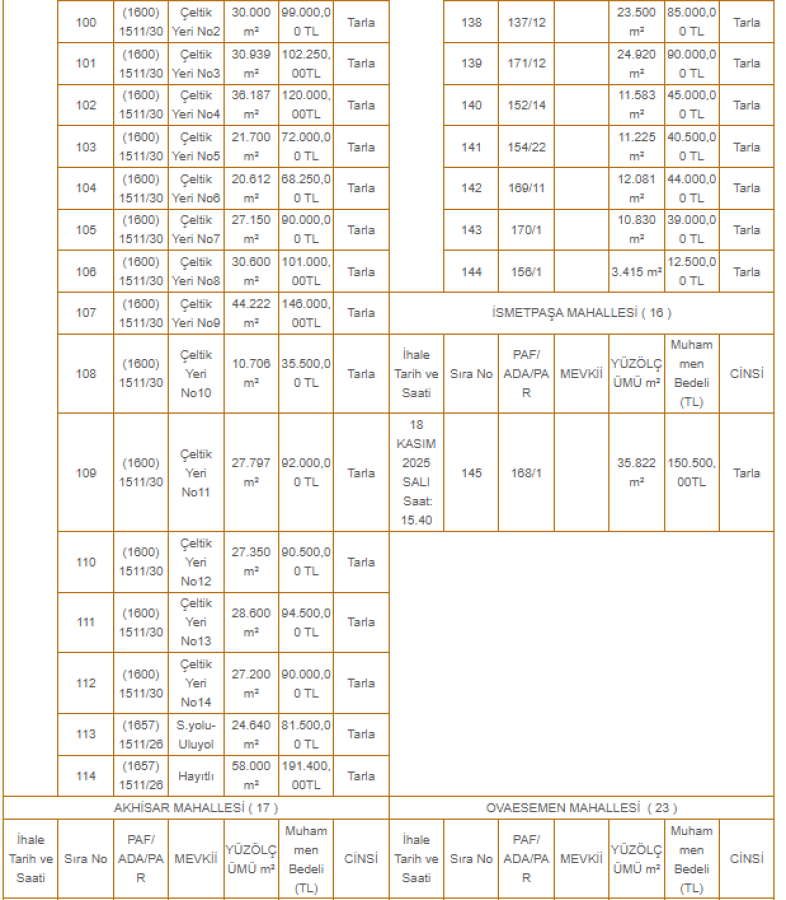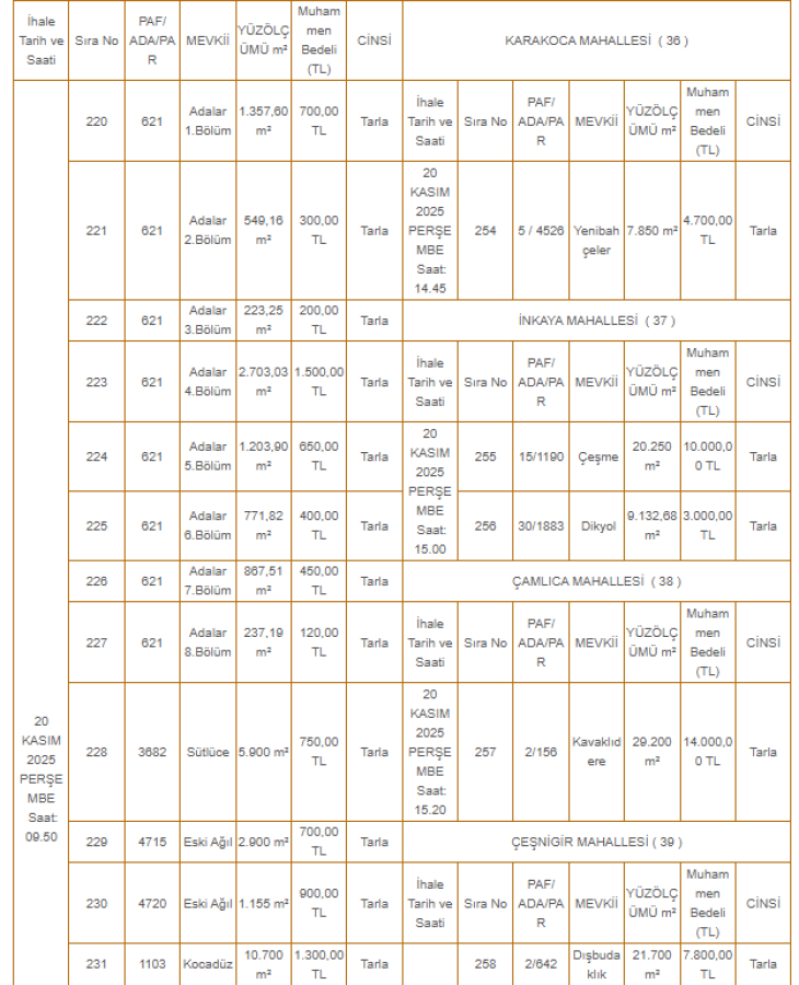 İhale sırasında, ilgili ihale yerinde (taşınmazların bulunduğu mahallelerin Muhtarlık Hizmet Binalarında) hazır bulunmayan veya noterden tasdikli vekâletnameyi haiz bir vekil göndermeyen istekliler, ihalenin yapılış tarzına ve sonucuna itiraz edemezler.İlan Olunur.