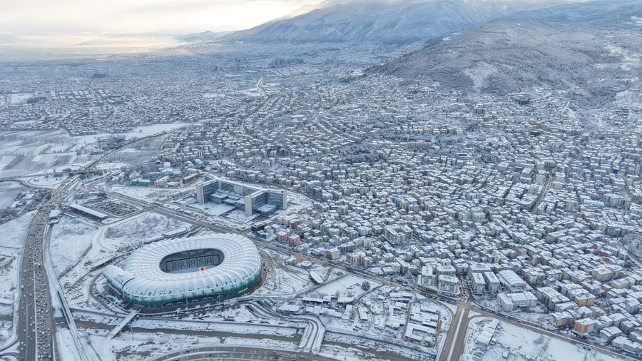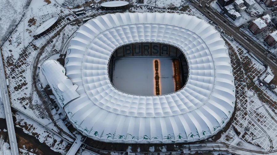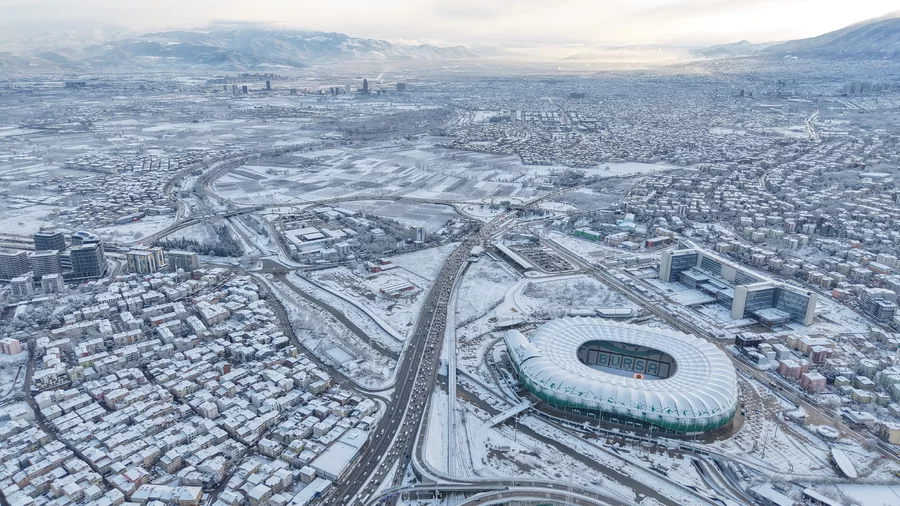 Bursa'da dün gece etkili olan kar yağışıyla birlikte Bursa'nın bir çok noktası beyaza büründü. Bursa'nın simgesi haline gelen Timsah Arena ismiyle bilinen Atatürk Spor Kompleksi Matlı Stadyumu, yeşille beyazın buluşmasıyla kartpostallık görüntüler ortaya çıkardı.