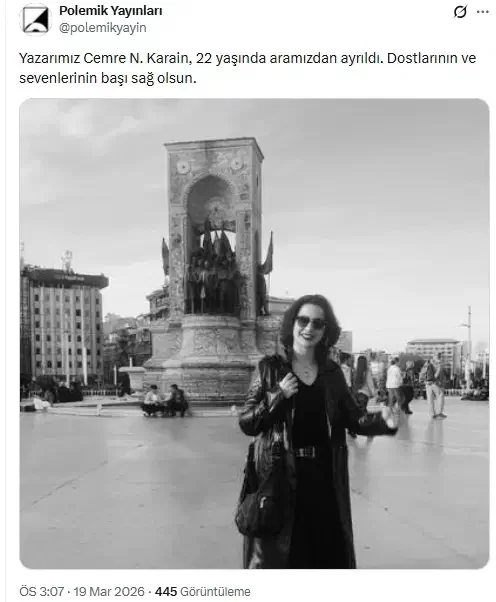 Cemre Nehir Karain'in kaleme aldığı "Şapkamdaki Nar Çiçekleri" adlı şiir kitabını yayımlayan Polemik Yayınevi, sosyal medya hesabı üzerinden yaptığı paylaşımla vefat haberini doğruladı. Yayınevi açıklamasında şu ifadelere yer verdi: