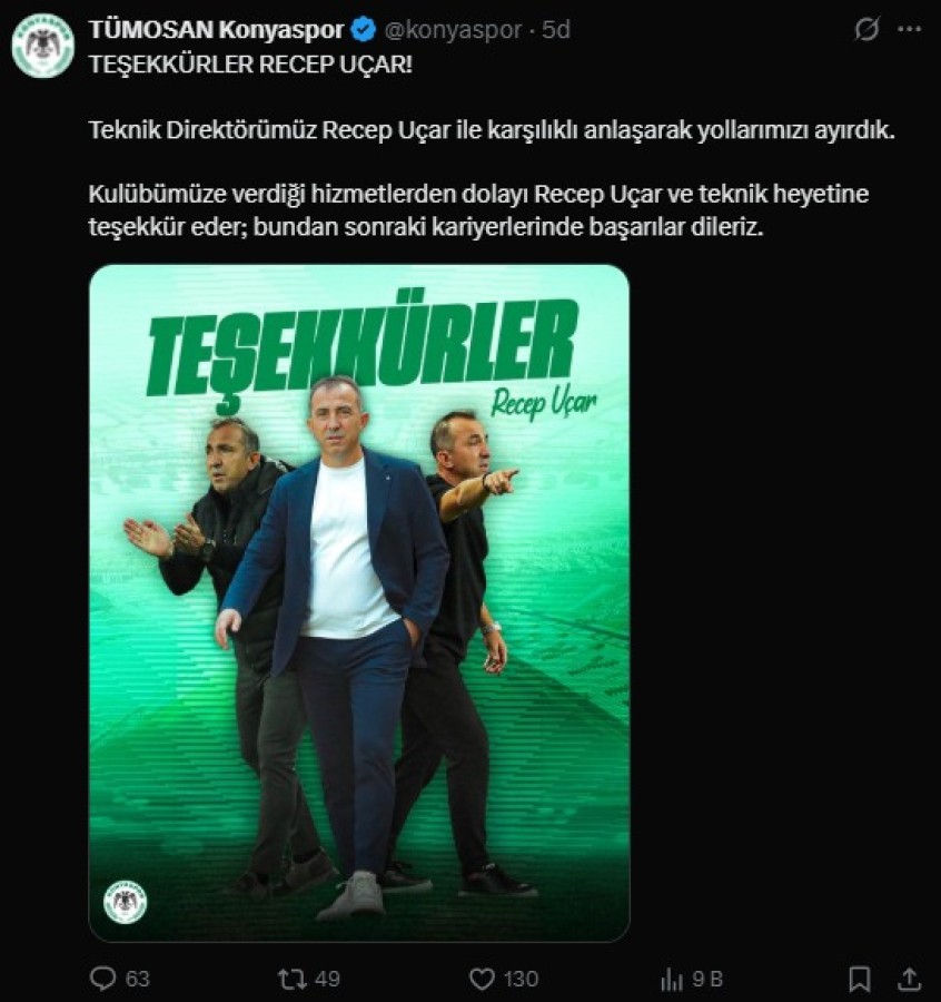 SPOR, 03 Kasım 2025 Pazartesi, 22:04Konyaspor, teknik direktör Recep Uçar'la yollarını ayırdığını açıkladı.