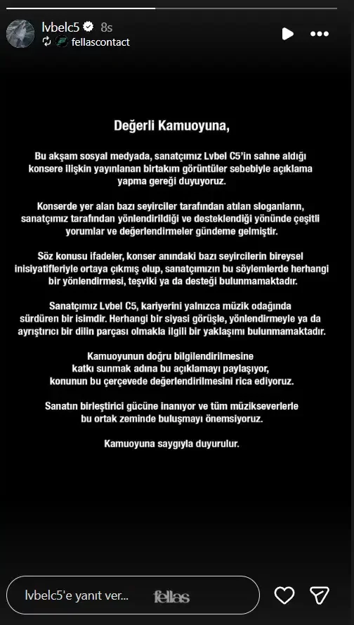 "Konserde yer alan bazı seyirciler tarafından atılan sloganların, sanatçımız tarafından yönlendirildiği ve desteklendiği yönünde çeşitli yorumlar gündeme gelmiştir. Söz konusu ifadeler, konser anındaki bazı seyircilerin bireysel inisiyatifleriyle ortaya çıkmış olup, sanatçımızın bu söylemlerde herhangi bir yönlendirmesi, teşviki ya da desteği bulunmamaktadır."