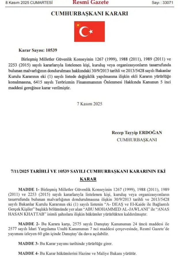 Buna göre, Birleşmiş Milletler Güvenlik Konseyinin (BMGK) ilgili kararlarıyla listelenen kişi, kuruluş veya organizasyonların tasarrufunda bulunan mal varlığının dondurulmasına ilişkin 30 Eylül 2013 tarihli Bakanlar Kurulu kararının ekindeki listenin "DEAŞ ve El Kaide ile Bağlantılı Gerçek Kişiler" başlıklı bölümünde yer alan "Abu Mohammed Al-Jawlani ile Anas Hasan Khattab" isimli şahıslara ilişkin hükümler kaldırıldı.