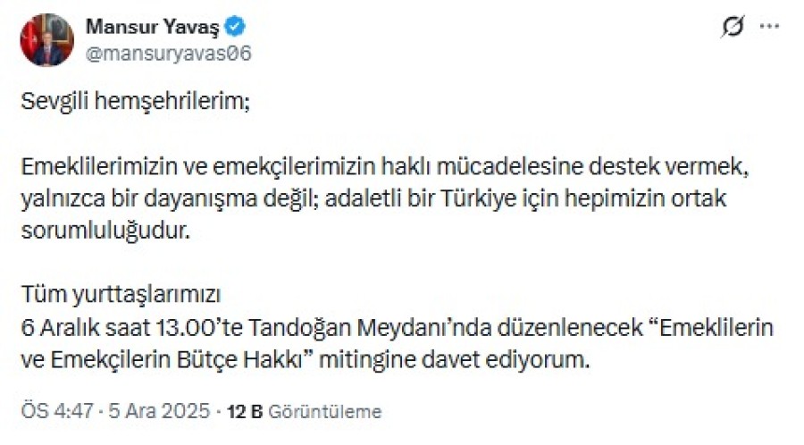 Sosyal medya hesabından yaptığı paylaşımda, "Emeklilerimizin ve emekçilerimizin haklı mücadelesine destek vermek, yalnızca bir dayanışma değil; adaletli bir Türkiye için hepimizin ortak sorumluluğudur" diyen Yavaş, yurttaşlara miting çağrısında bulundu.