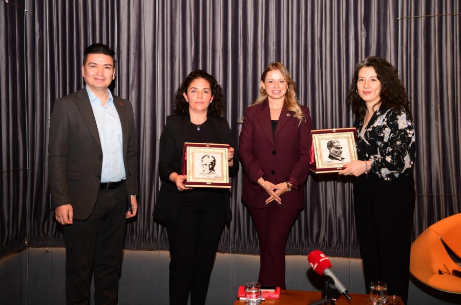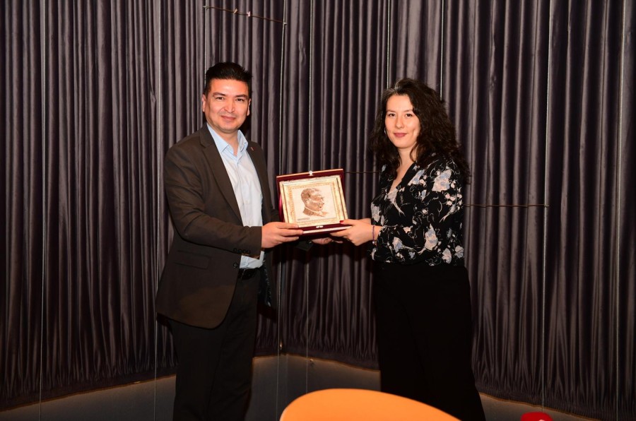 Söyleşinin ardından Osmangazi Belediyesi Basın Yayın ve Halkla İlişkiler Müdürü Süleyman Çavlı, Esra Türker ve Hatice Nur Derya'ya Atatürk plaketi takdiminde bulundu.