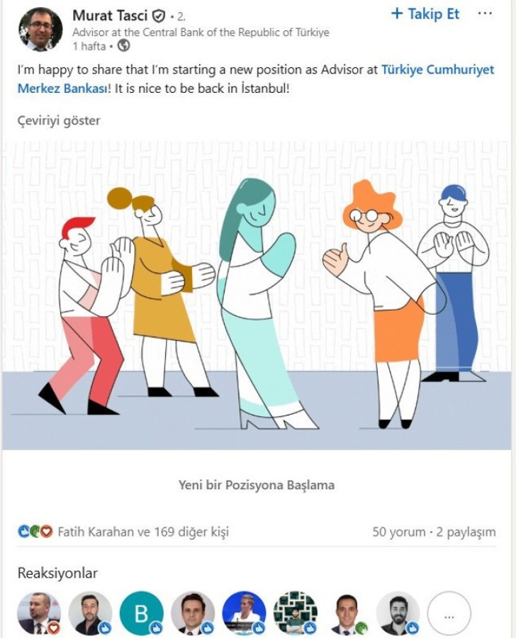TCMB'nin yeni danışmanı olarak göreve gelen Murat Taşçı, göreve başladığını LinkedIn profilinde paylaştı. Profildeki tek gönderi bu olurken, görev başlangıcını tebrik edenlerin içinde TCMB Başkanı Fatih Karahan önde yer aldı.