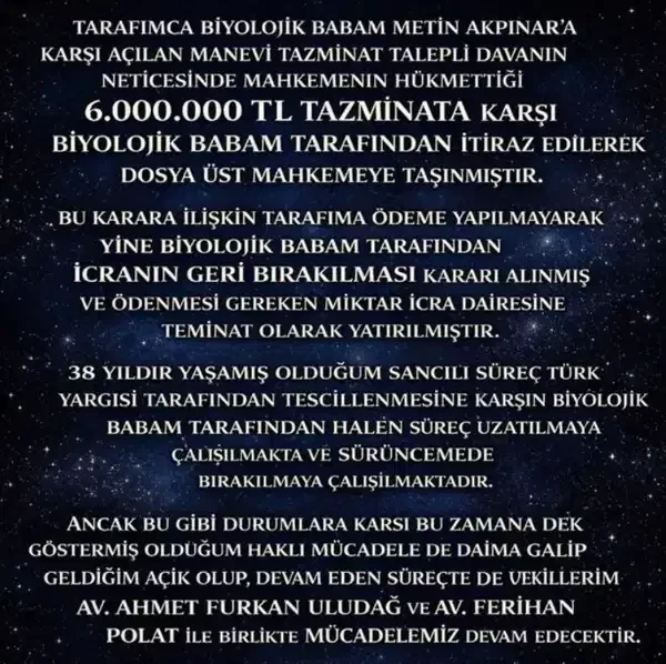 "Tarafımca biyolojik babam Metin Akpınar'a karşı açılan manevi tazminat talepli davanın neticesinde mahkemenin hükmettiği 6.000.000 TL tazminata karşı biyolojik babam tarafından itiraz edilerek dosya üst mahkemeye taşınmıştır.